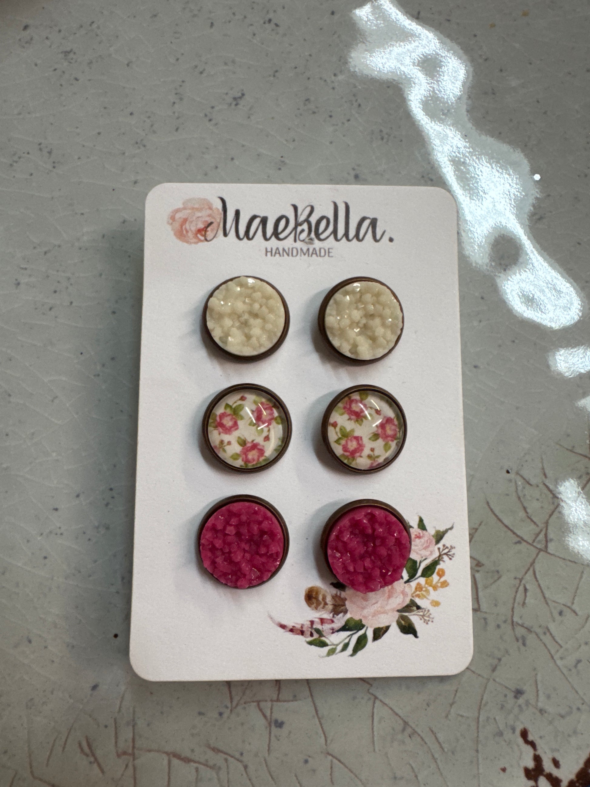 This variety of shades of rose resin druzies are set in stainless steel settings.