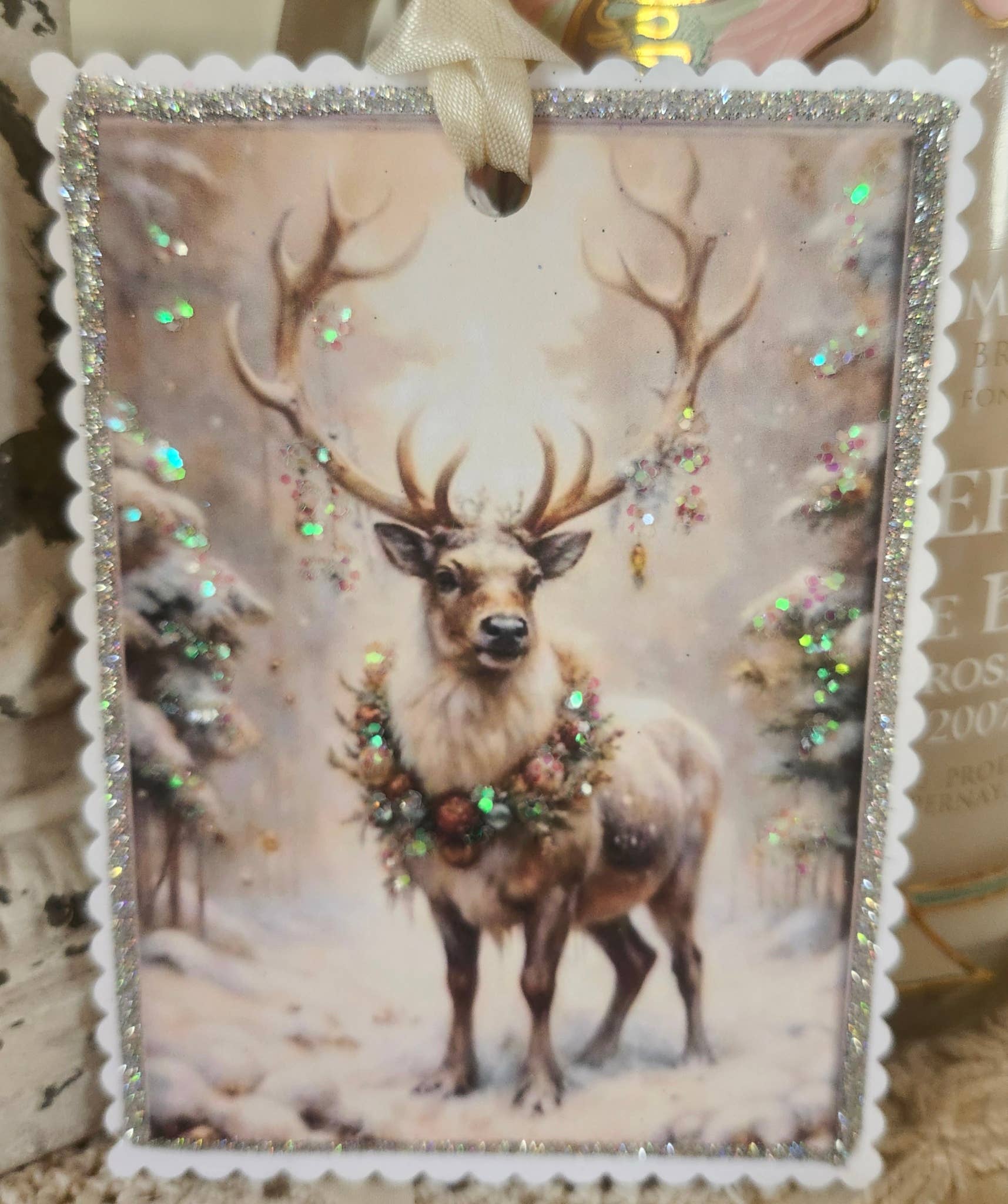 Christmas Gift Tag Gorgeous Deer n Wreath Glitter