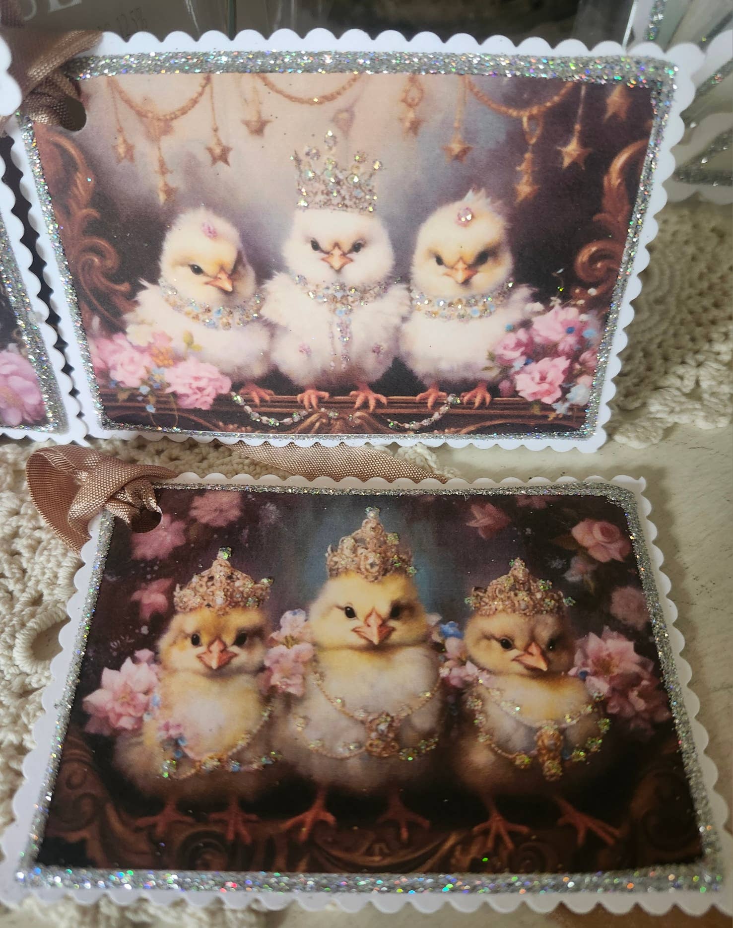 This is a fun gift tag set of 4, of three Royal Chicks with just the right amount of glitter bling. Perfect to add to a gift or it is the gift. Made with heavy cardstock they are four layers thick so they are very durable. They come individually wrapped.