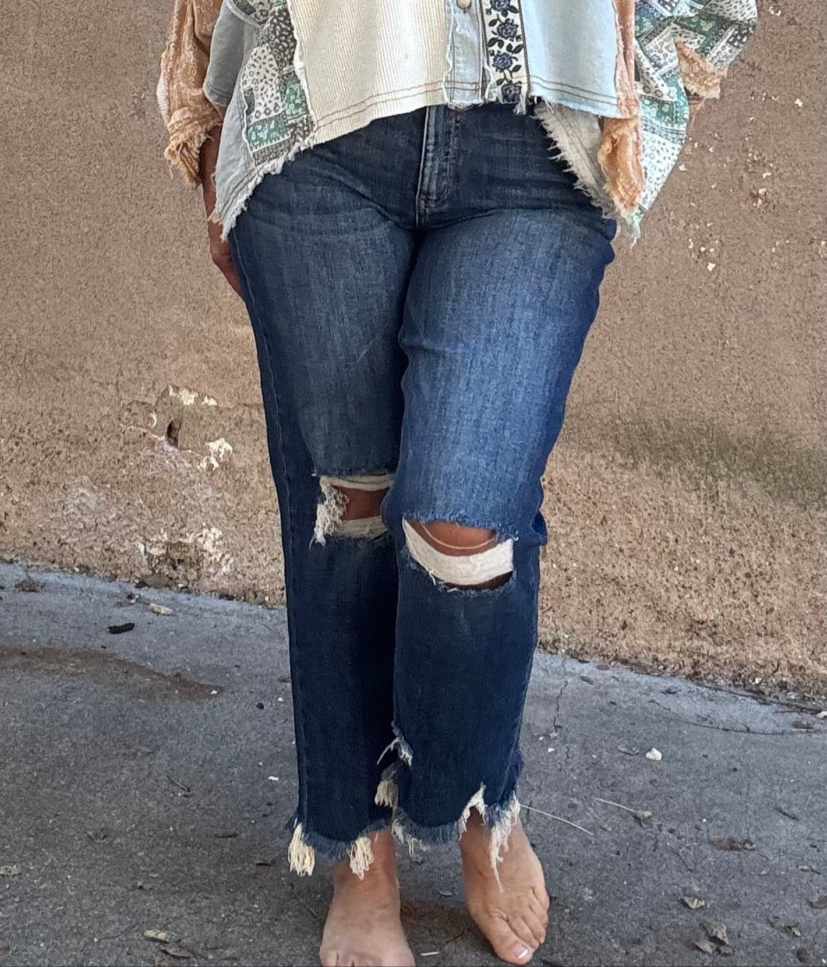 COMFORT STRETCH DENIM, HIGH RISE WAIST, DISTRESSED DETAIL, DESTRUCTED HEM, CROPPED LENGTH, STRAIGHT JEANS