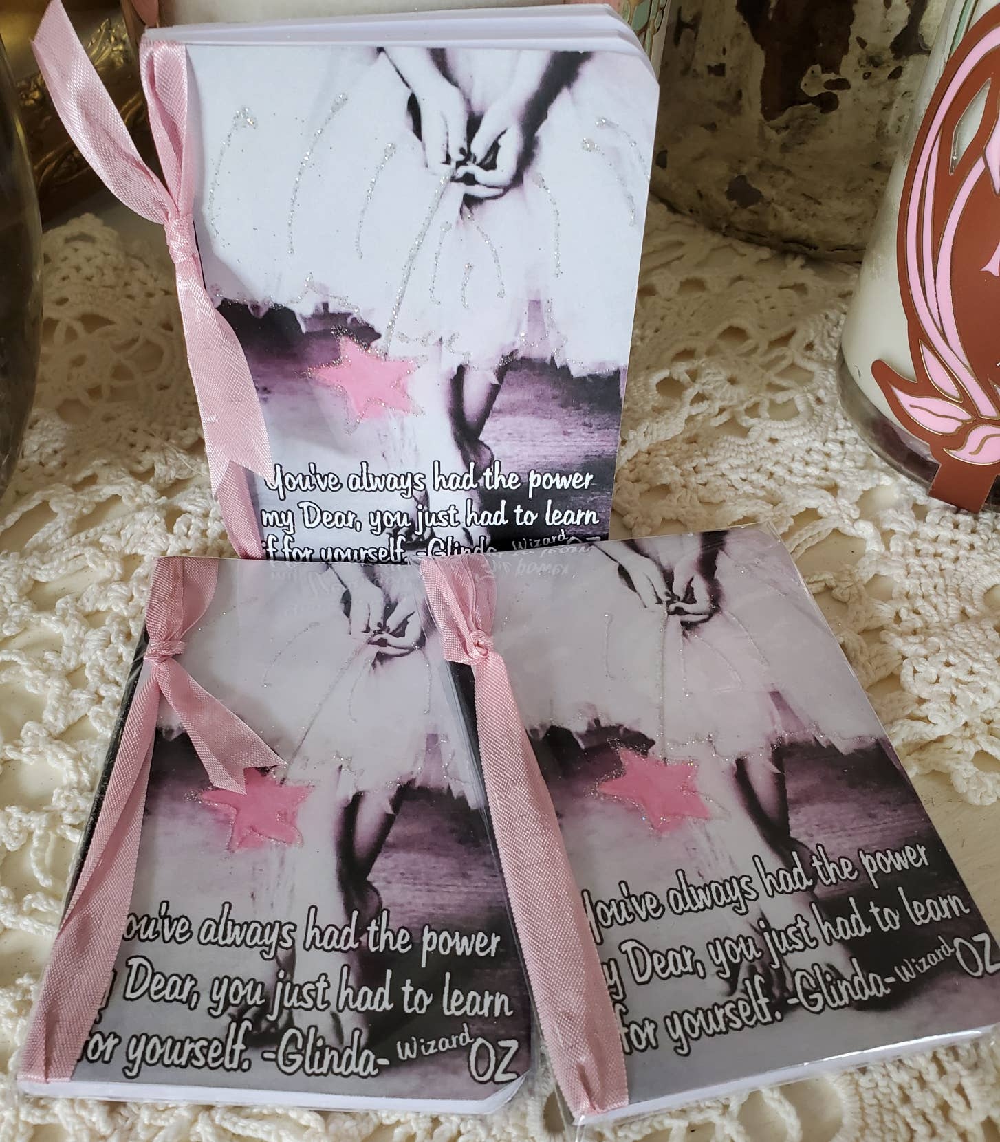 This is a lovely mini journal notebook with just the right amount of glitter bling and it reads: You've always had the power my Dear, you just had to learn if for yourself. Glinda Wizard Oz