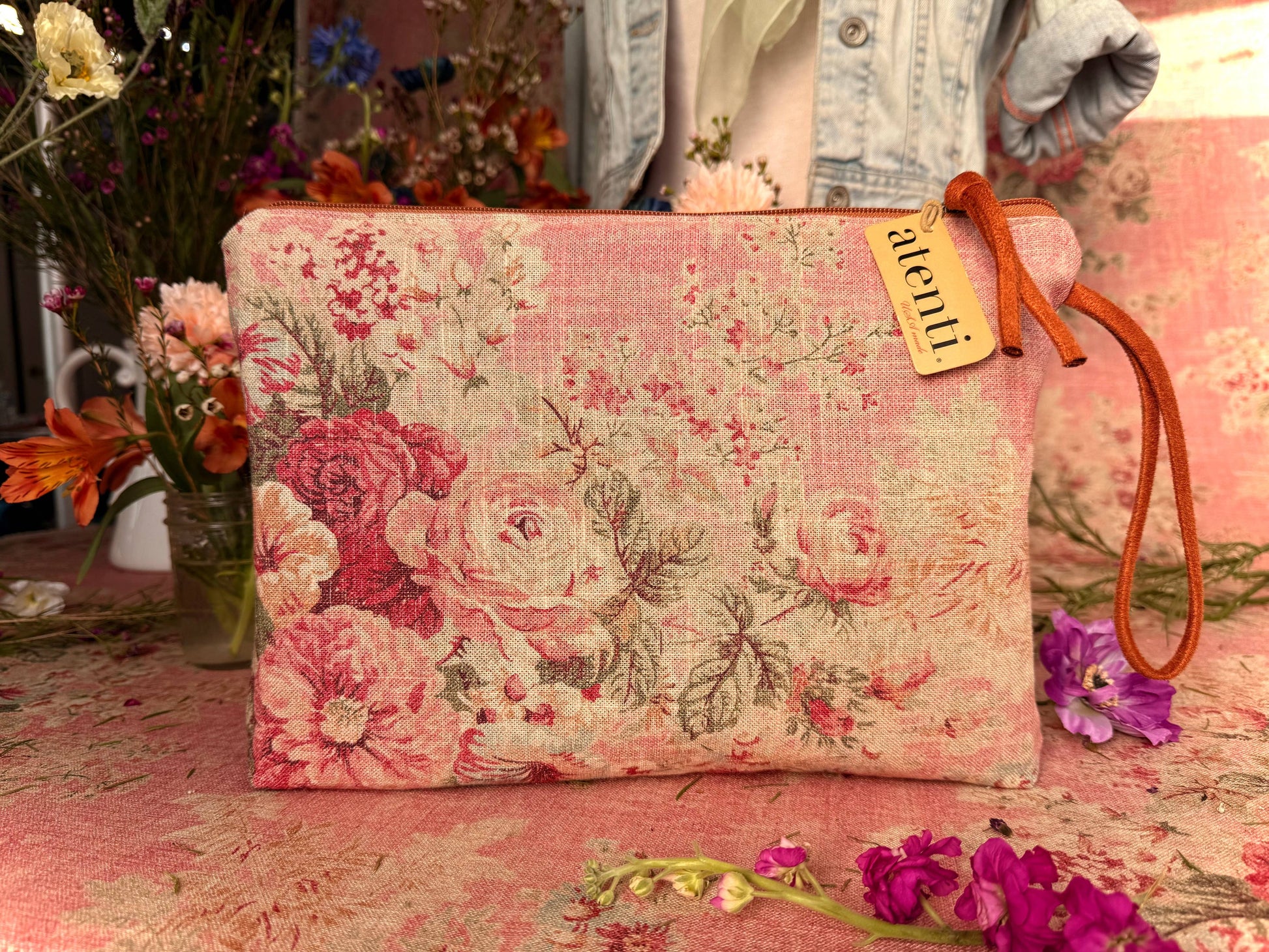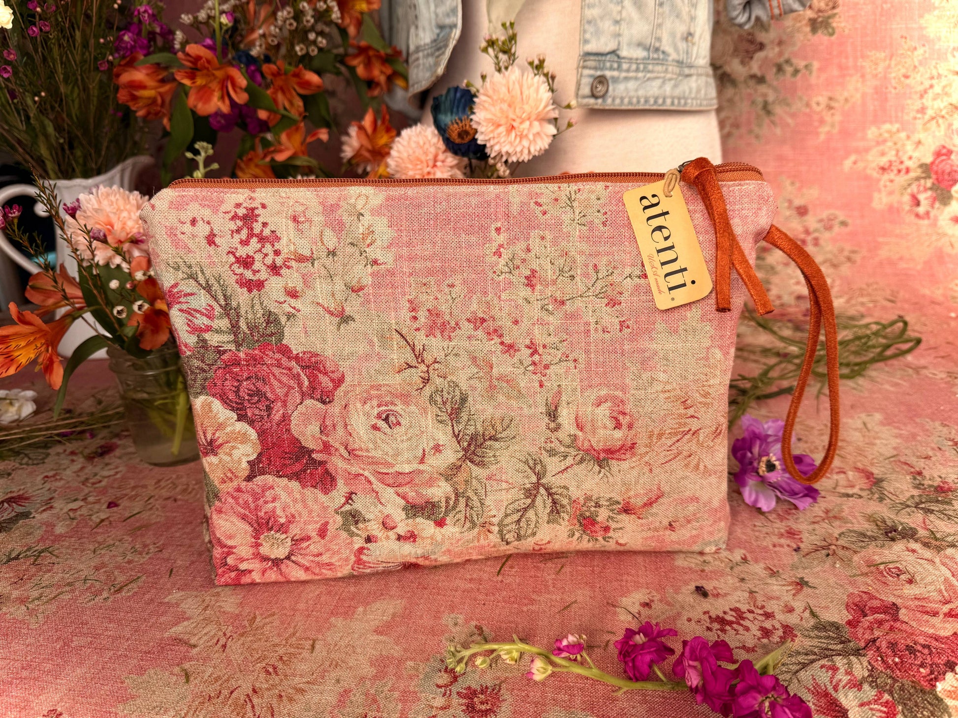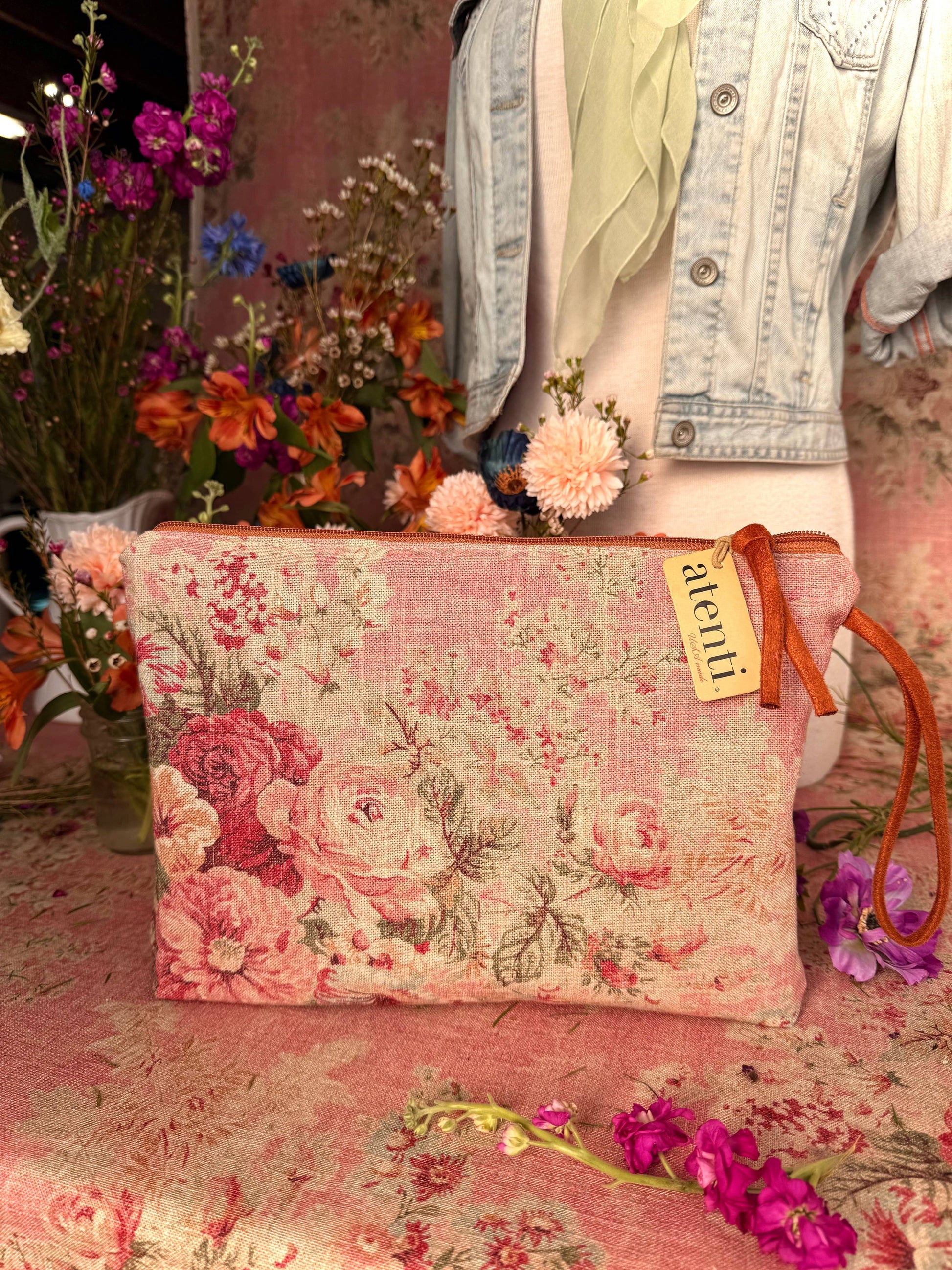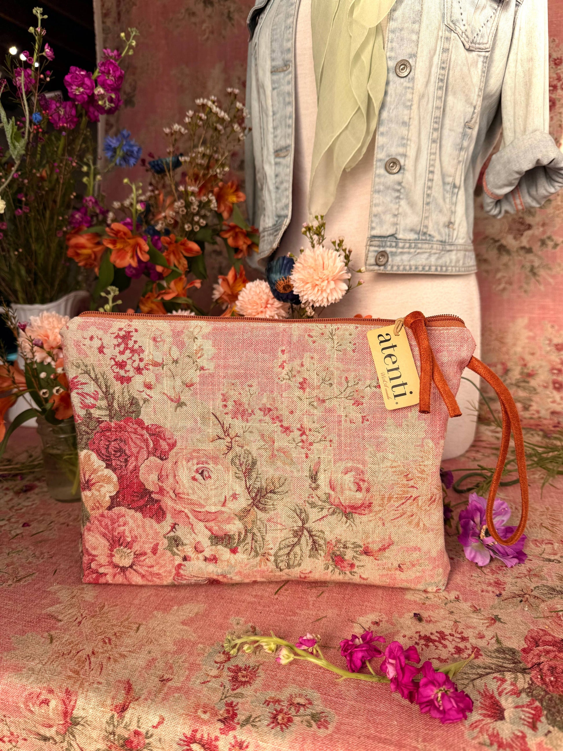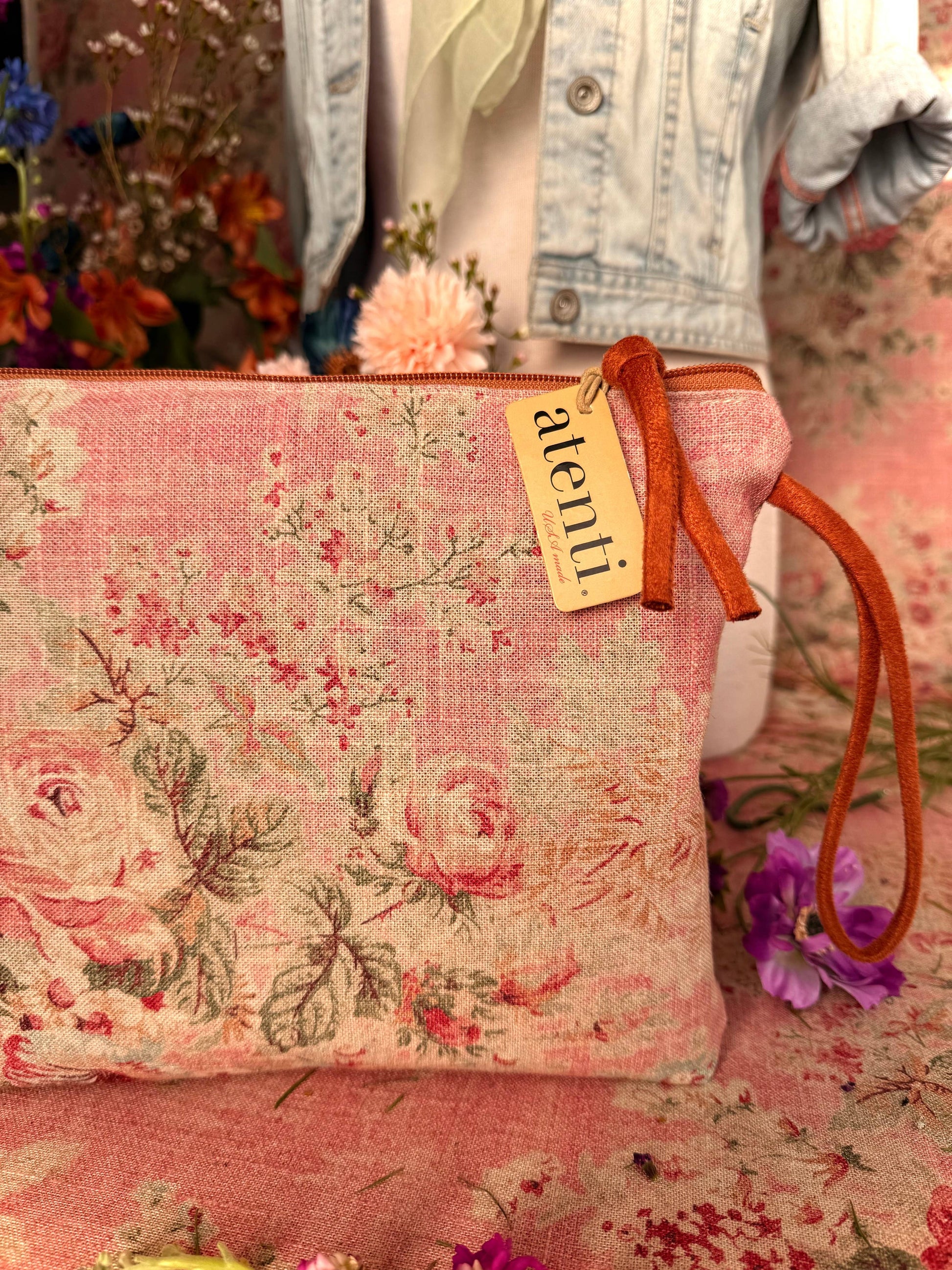 Secure your essentials with style and abundance! Never leave your essentials behind with the spacious Rosewood Grand Pouch. This romantic pouch adds a touch of grace to any ensemble, showcasing a stunning assortment of delicate florals in warm tones. The wrist loop allows for easy carrying. Make a statement with this luxurious accessory, perfect for any fashion-forward individual.
