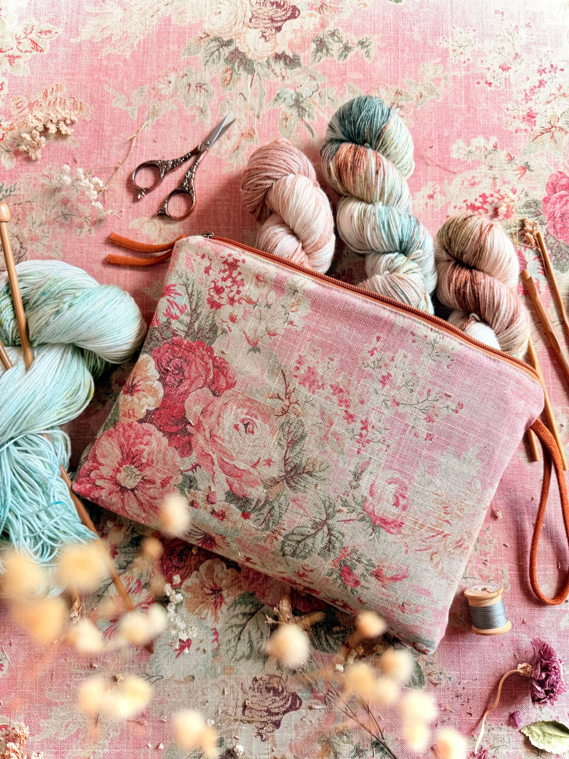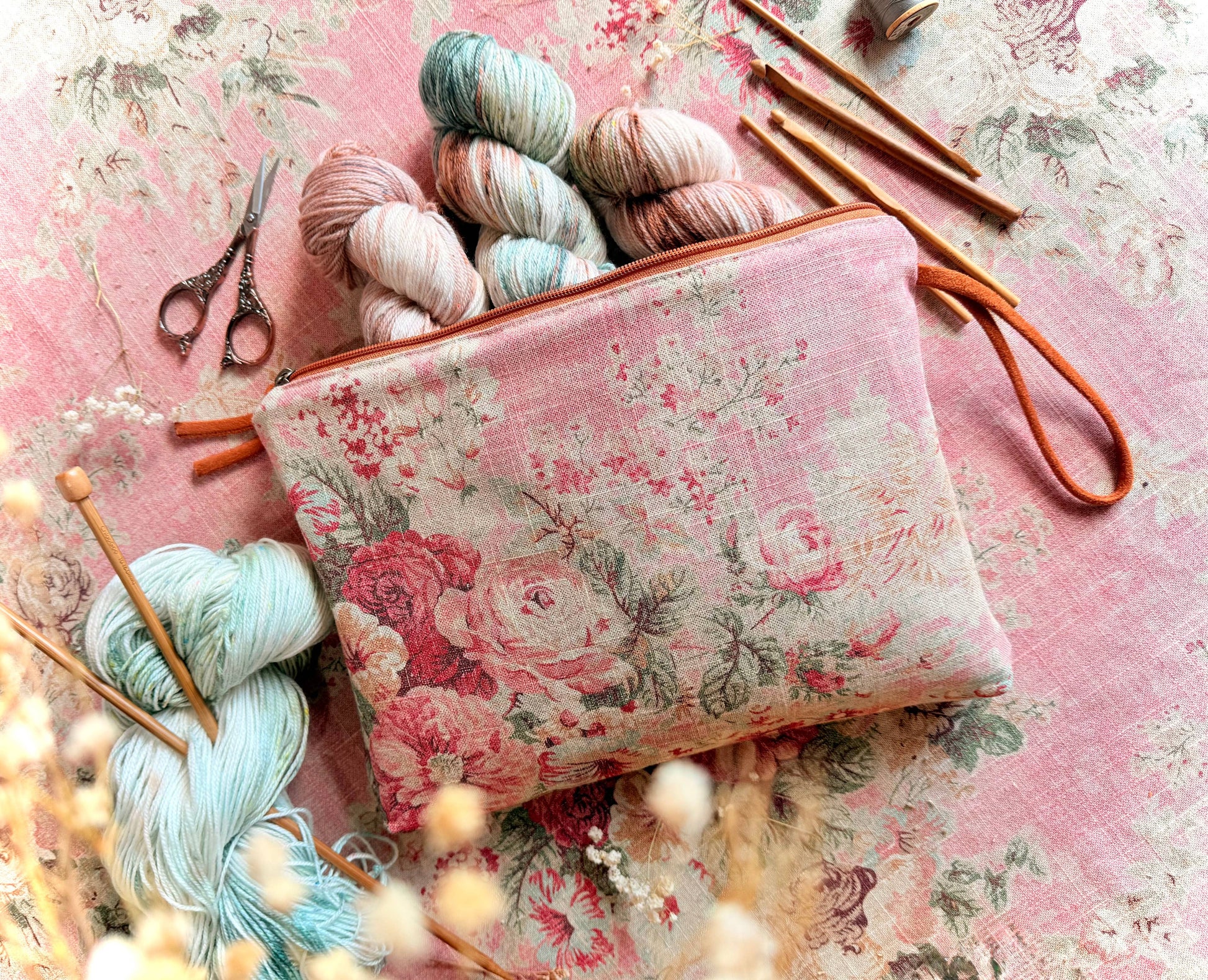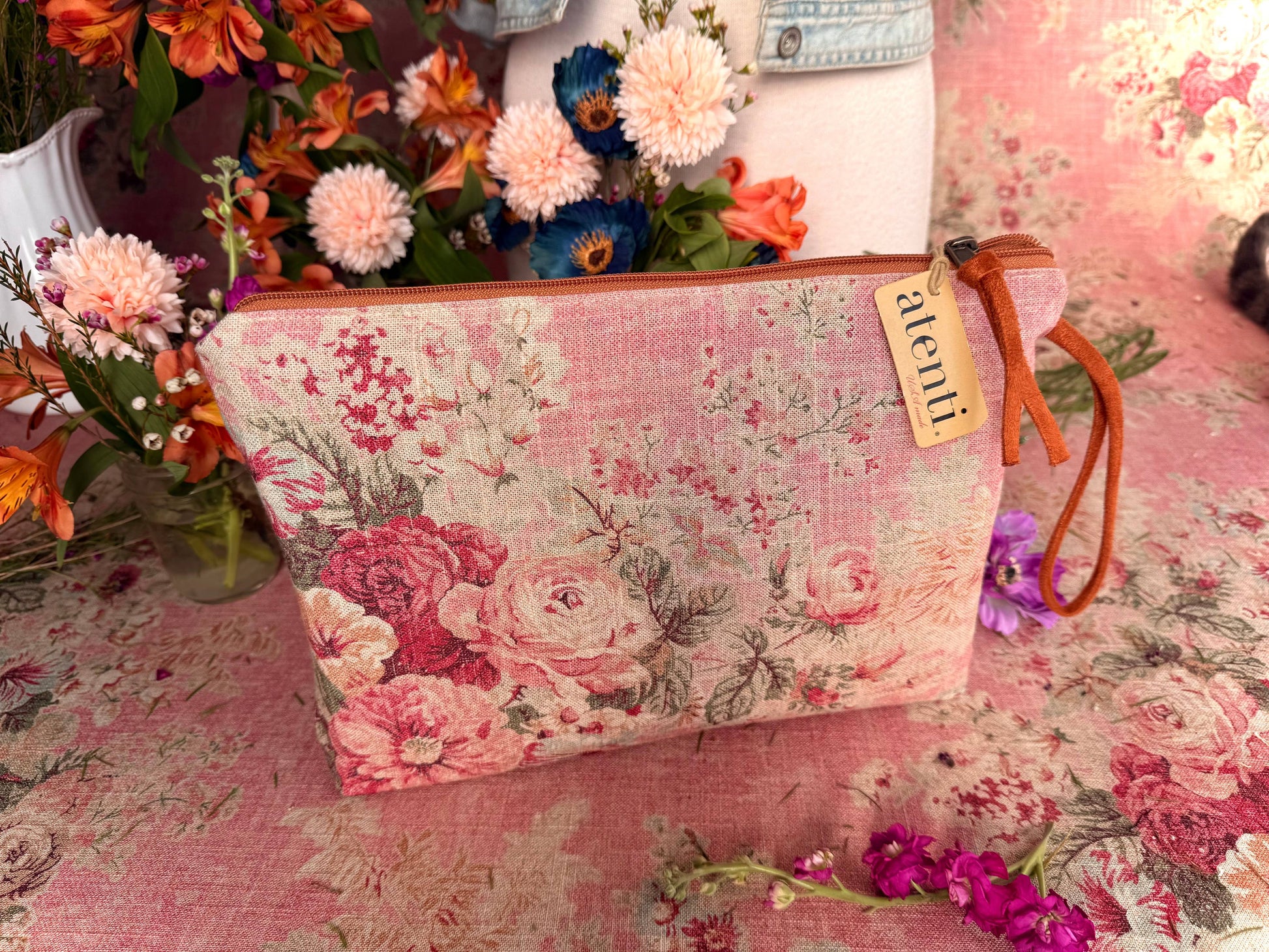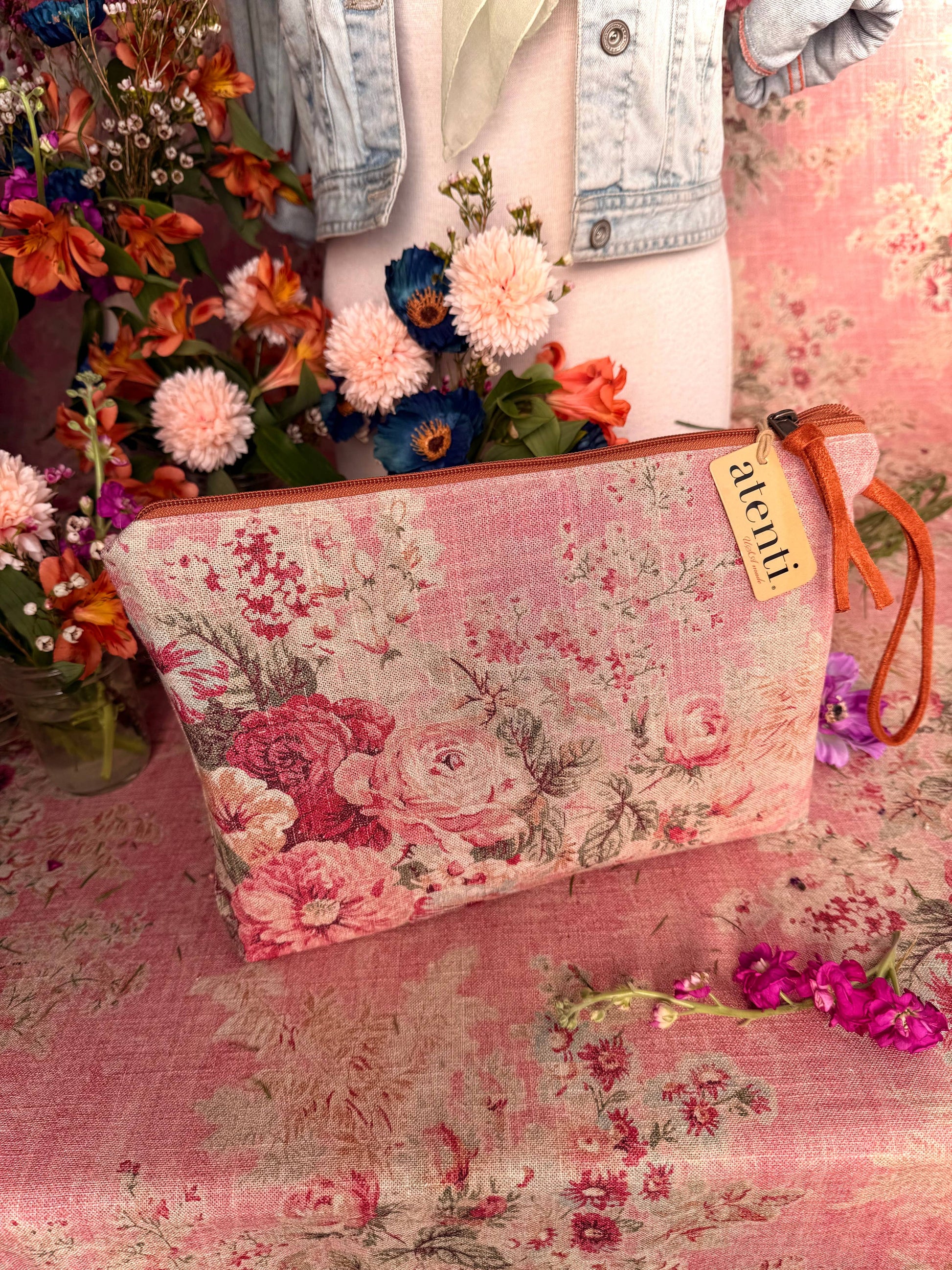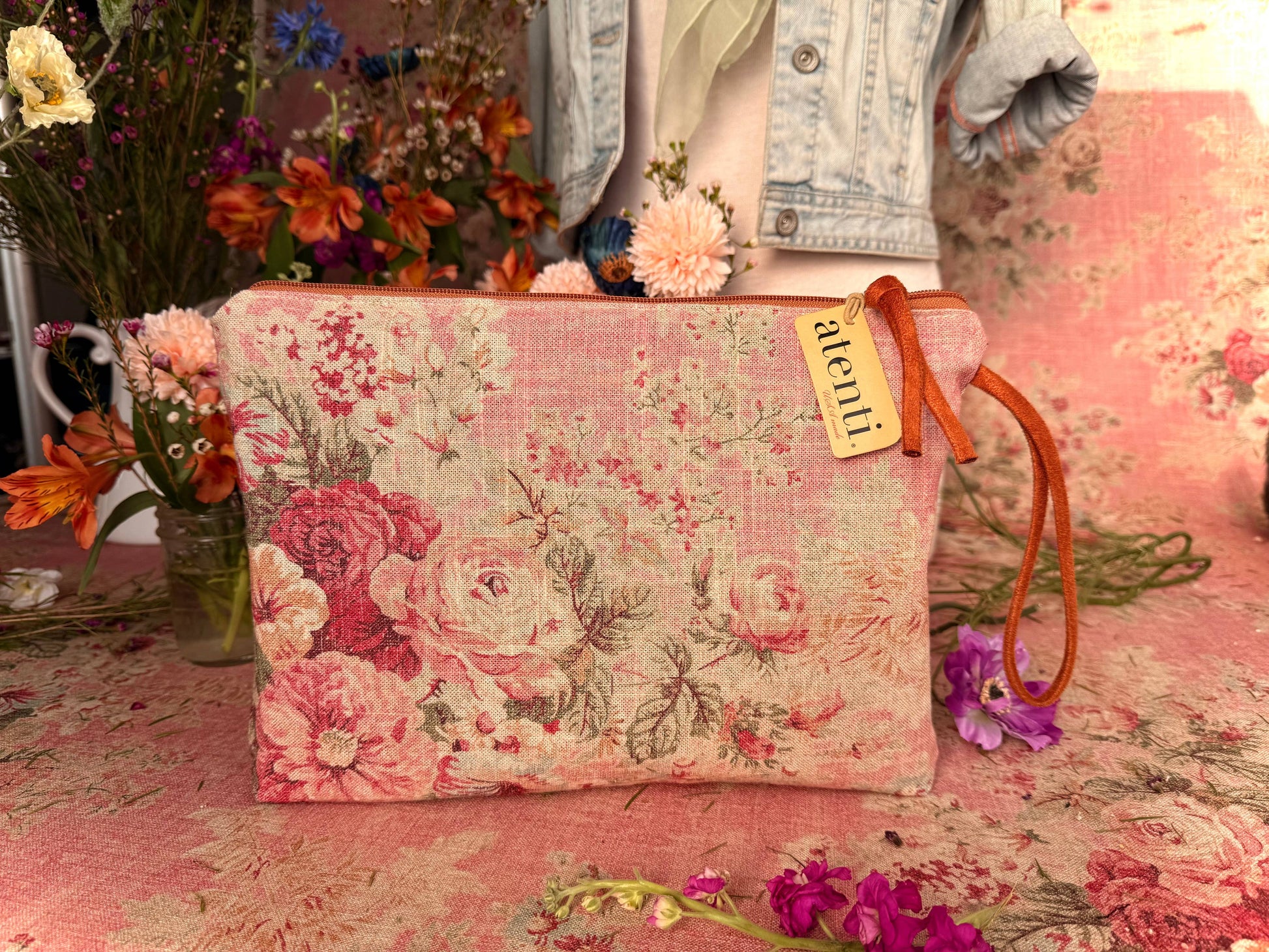 Secure your essentials with style and abundance! Never leave your essentials behind with the spacious Rosewood Grand Pouch. This romantic pouch adds a touch of grace to any ensemble, showcasing a stunning assortment of delicate florals in warm tones. The wrist loop allows for easy carrying. Make a statement with this luxurious accessory, perfect for any fashion-forward individual.