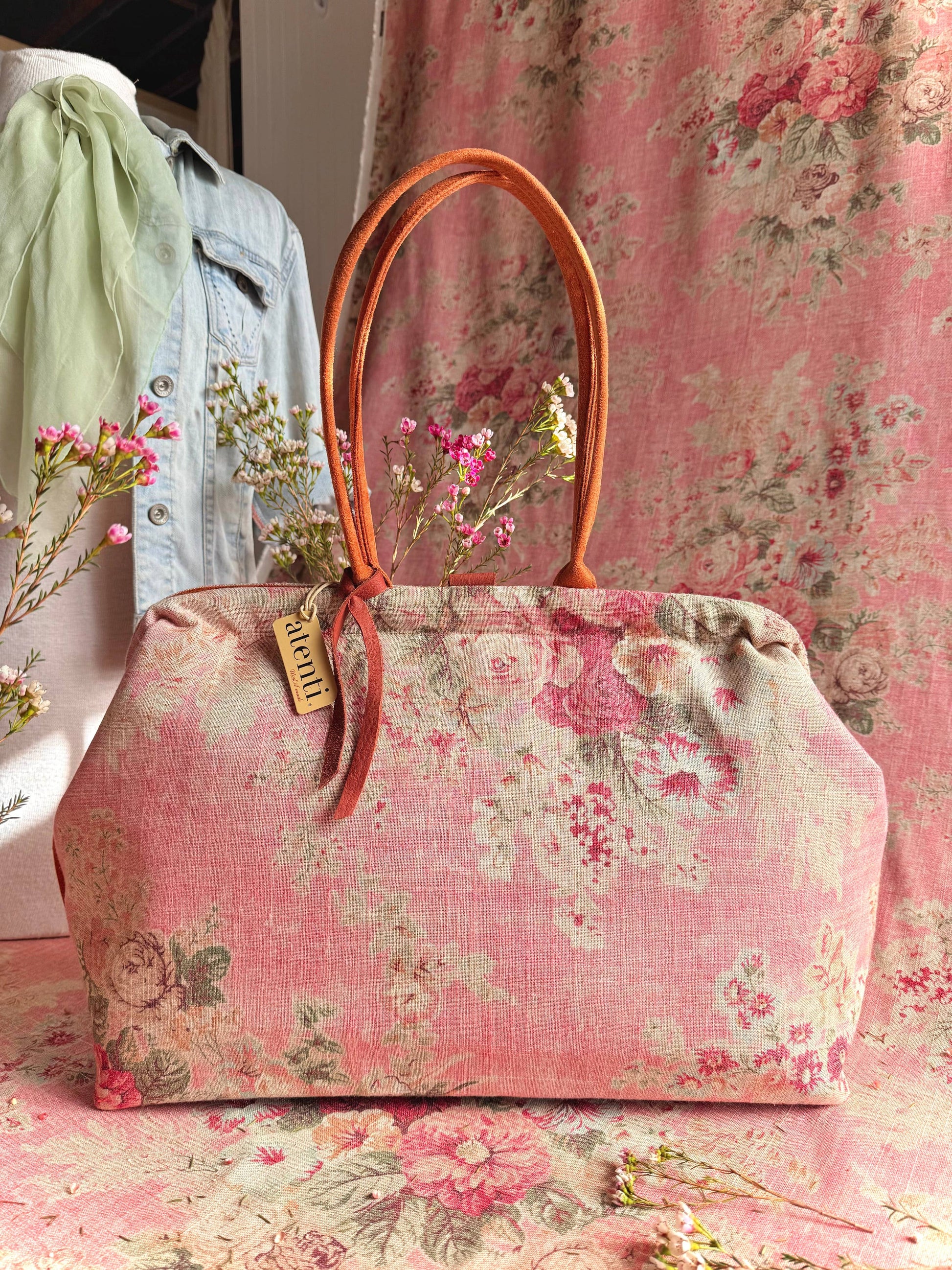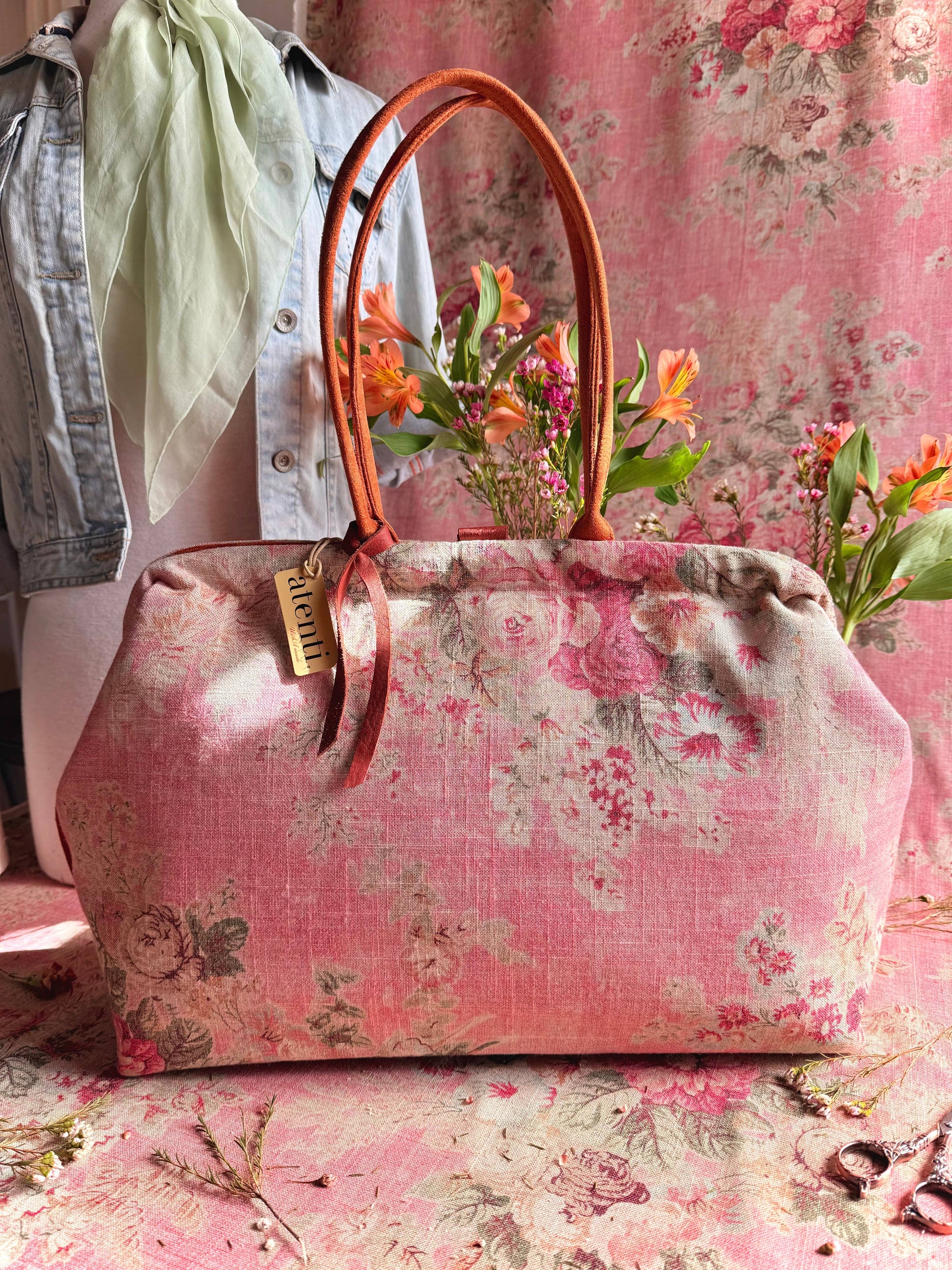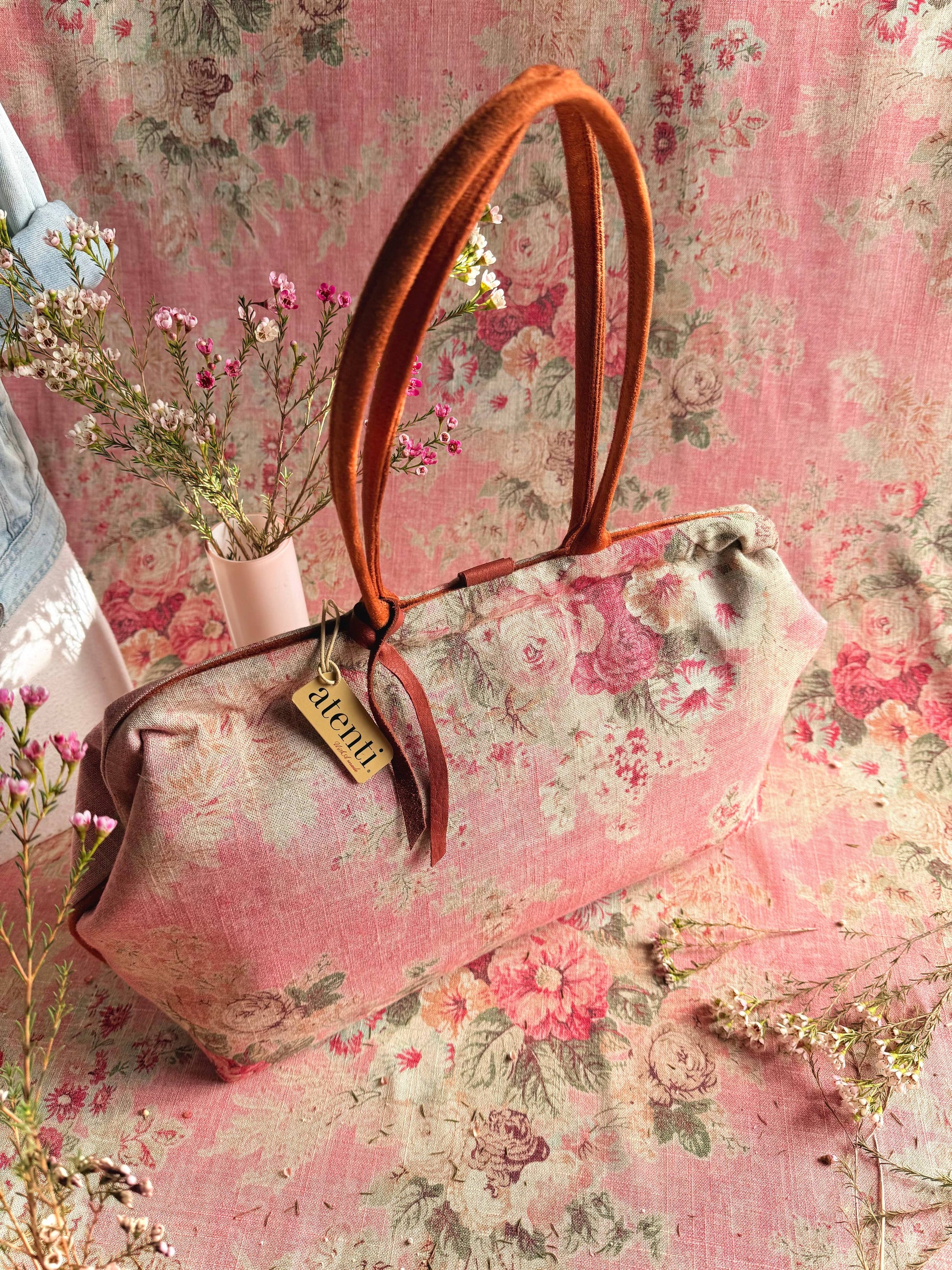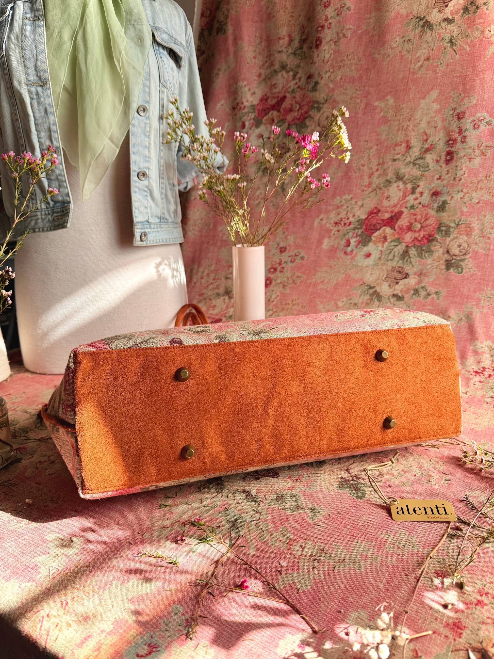This romantic bag adds a touch of grace to any ensemble. Indulge in timeless elegance, with the Rosewood Pioneer. Showcasing a stunning assortment of delicate florals in warm tones. The Atenti Pioneer carpet bag shows off a fully lined water resistant taffeta interior. Inside are a zippered pocket and an open divided pocket with a cell phone slot. The Pioneer has double 21” straps with a 10’ drop and metal feet.