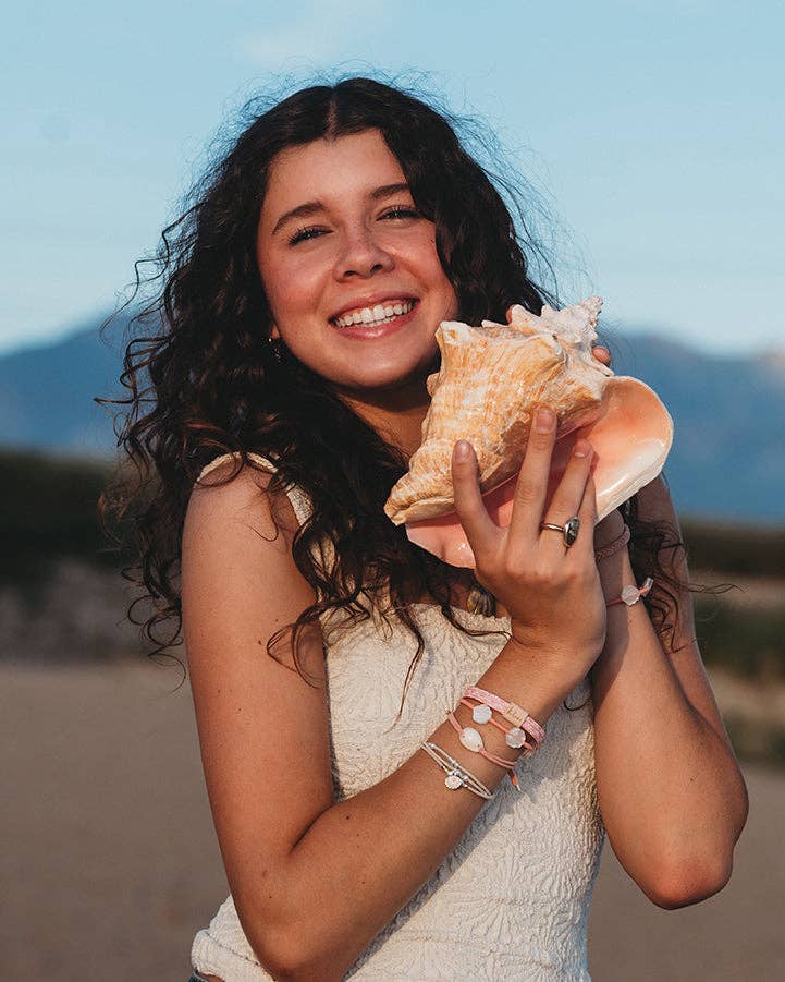 Our "Shimmer" set includes five bracelets that double as hair ties in beautiful corals and creams inspired by the shimmery seashells washed up on the beach. The set features seashells, pearls, and silver beads that will surely bring the sandy and salty vibes of the beach to your everyday life.