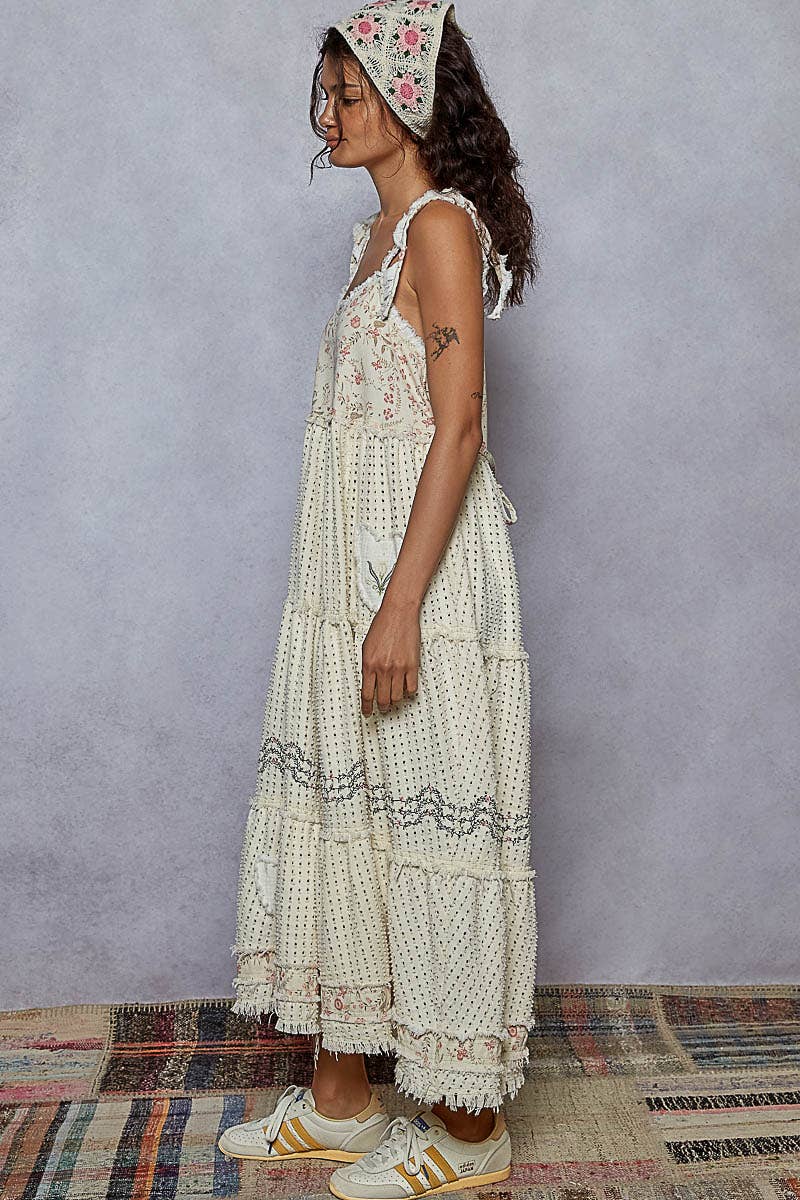 Designed in round neck sleeveless regular fit long dress in textured denim/twill with print patch, ruffle strap point, embroidery, outseam, vintage washing, solid color.