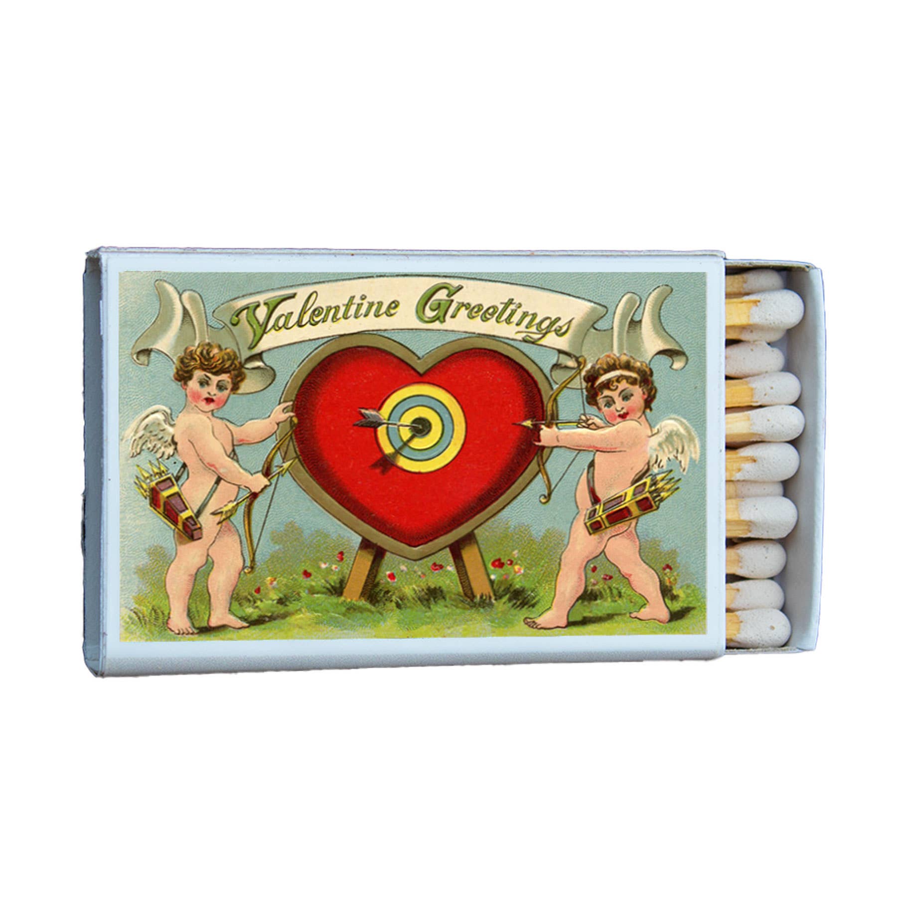 • This unique box of matches features a beautiful image of Cupid with a target on both sides