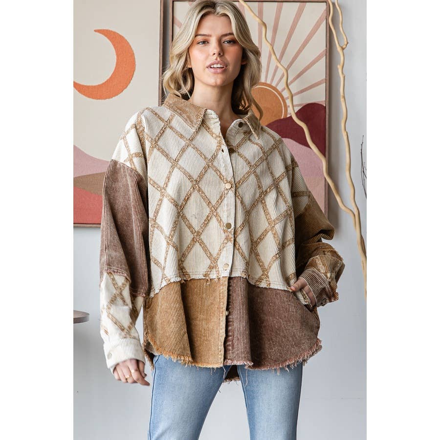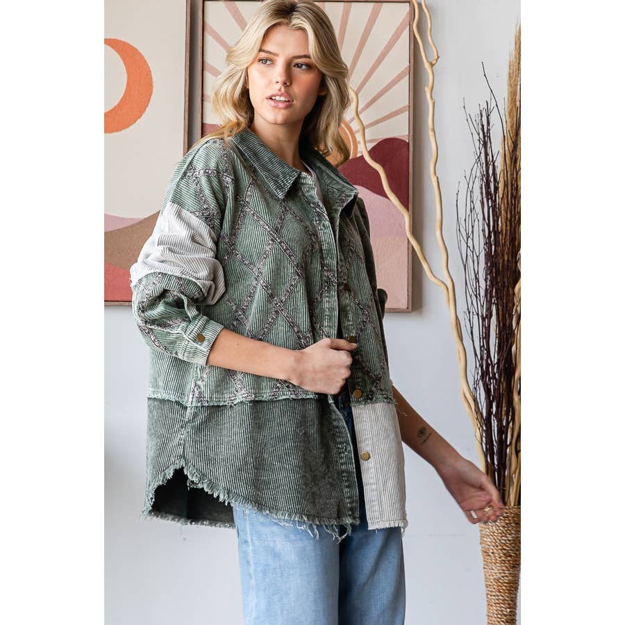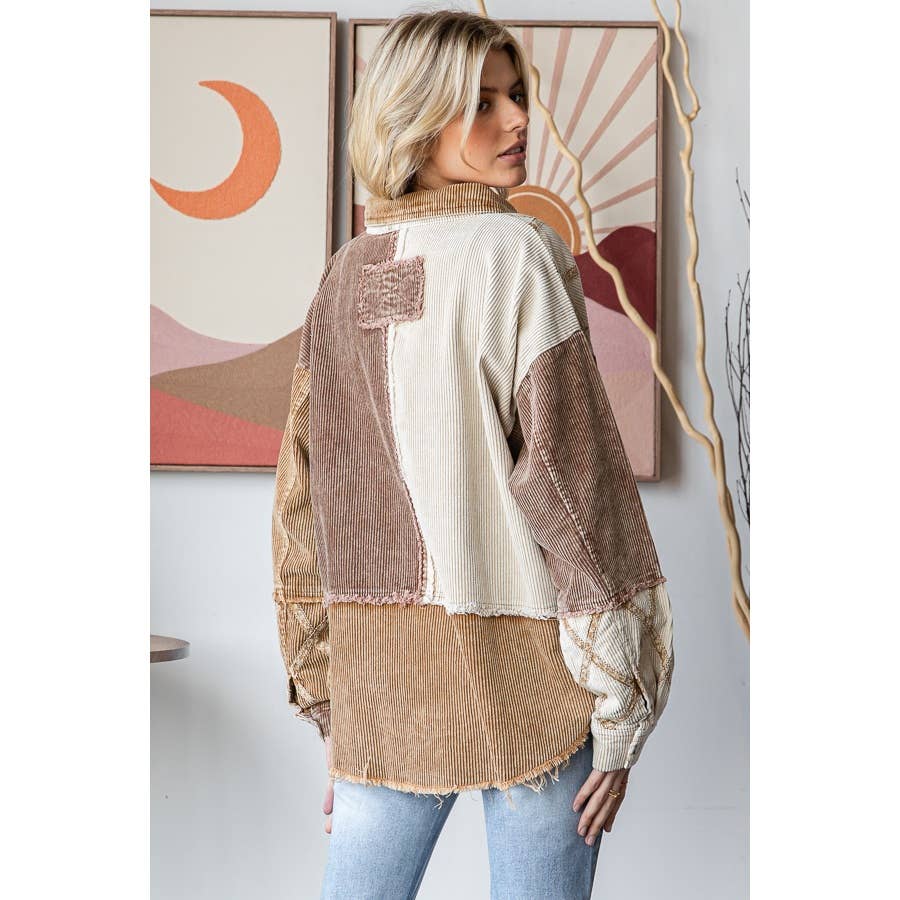 WASHED CORDUROY COLORBLOCK BUTTON DOWN SHACKET